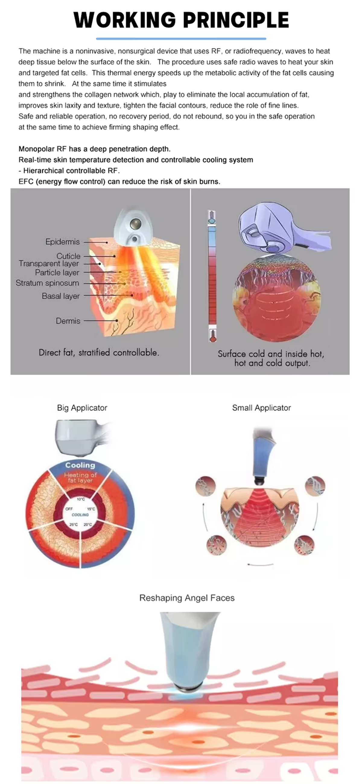 Этот продукт обеспечивает уменьшение жира и укрепление кожи благодаря «тепловому эффекту» RF, и весь процесс соответствует законам человеческого метаболизма. Ее основные механизмы заключаются в следующем: