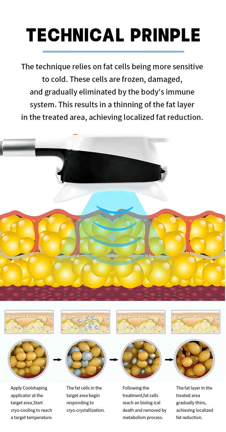 Основываясь на биологическом свойстве «жировые клетки более чувствительны к низким температурам», устройство точно контролирует температуру зоны обработки на уровне около 4°C, вызывая естественный апоптоз жировых клеток. Однако такие ткани, как кожа и мышцы, не повреждаются из-за их высокой толерантности. Апоптозные жировые клетки постепенно метаболизируются и выводятся через лимфатическую систему человека, в конечном итоге уменьшая толщину жирового слоя с долгосрочным эффектом (при правильном питании и физических упражнениях восстановиться нелегко).