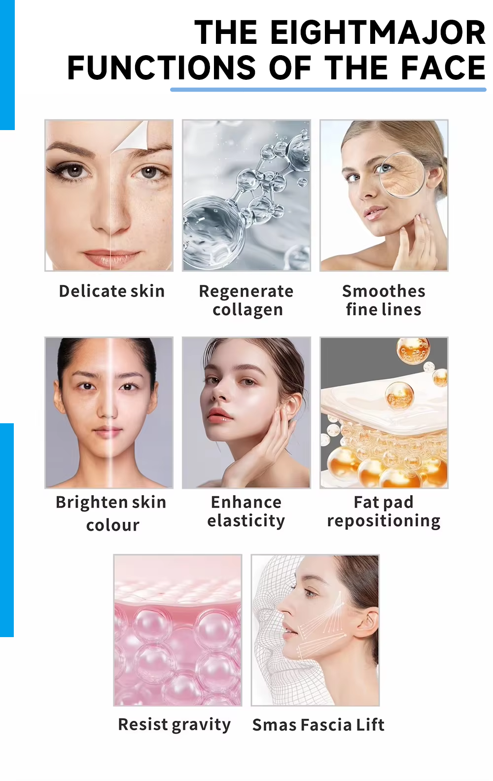 Используя технологию микроимпульсного фокусированного ультразвука (MPFU), он точно фокусирует энергию ультразвука на различных слоях кожи. Благодаря многомерному действию «линий, точек и поверхностей» он стимулирует регенерацию и ремоделирование коллагена, реализуя всестороннюю борьбу со старением и достигая таких эффектов, как укрепление и подтяжка, а также уменьшение морщин.