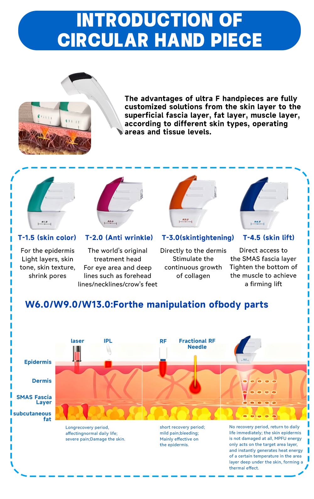 В нем используется технология фокусировки микроультразвука (микроультразвук HIFU), которая фокусирует энергию ультразвука на определенных глубинах подкожного слоя (например, слой фасции SMAS, слой дермы и т. д.) с точностью на микронном уровне: